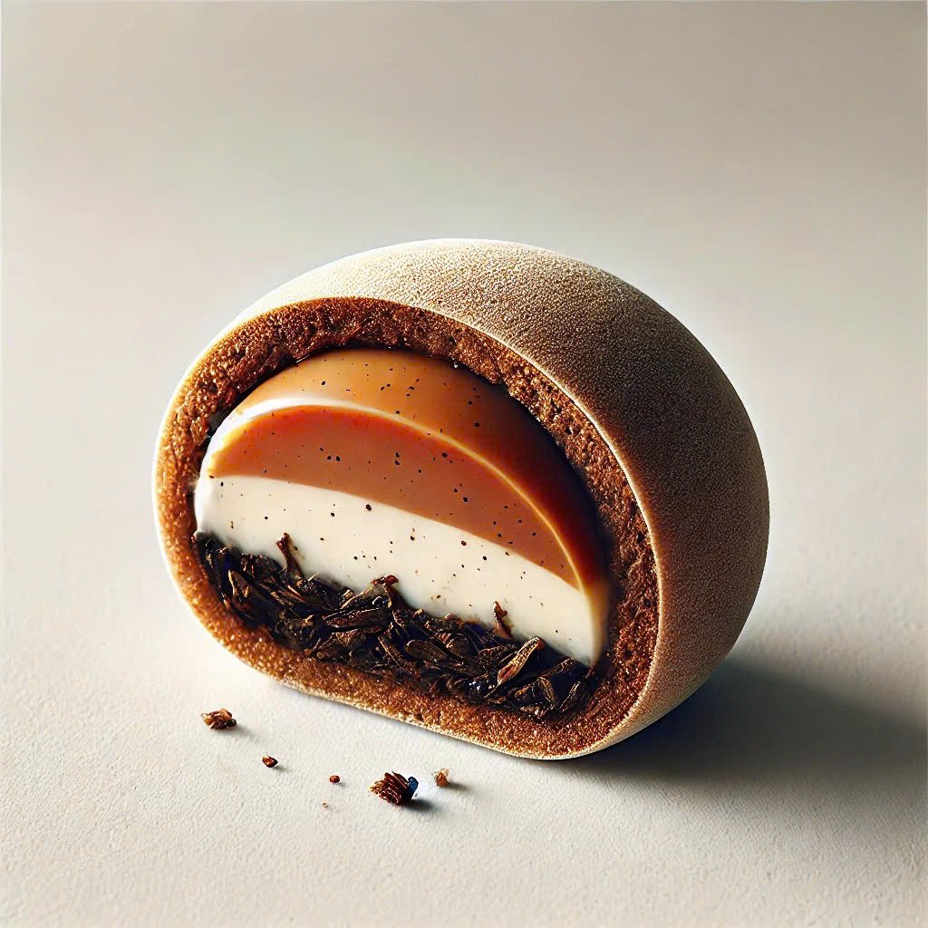 A rich and comforting blend of deep flavors and textures. This mochi features a smooth black tea ganache cream, paired with luscious milk pudding and the caramelized sweetness of brown sugar. Dark chocolate crumbs add a delightful crunch, making each bite a perfect balance of creamy and bittersweet notes.